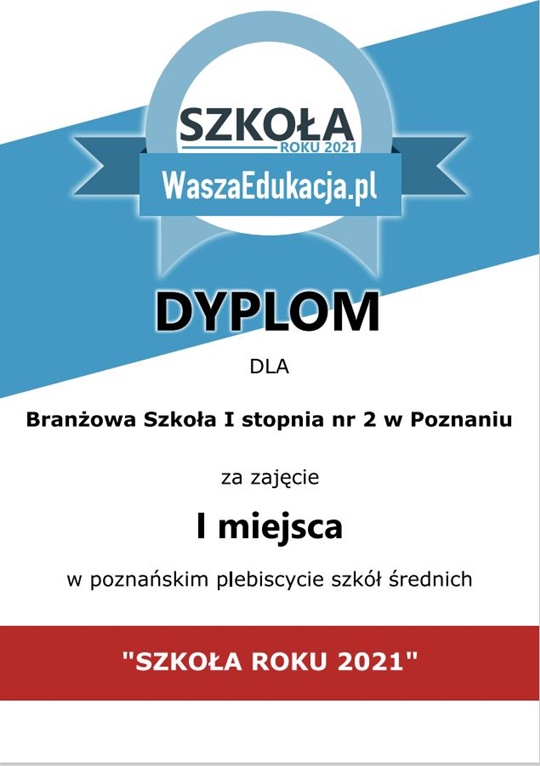 Szkoła Branżowa I stopnia przy Zespole szkół Zawodowych nr 2 w Poznaniu zajmuje 1 miejsce w plebiscycie Szkoła Roku 2021 portalu WaszaEdukacja.pl
