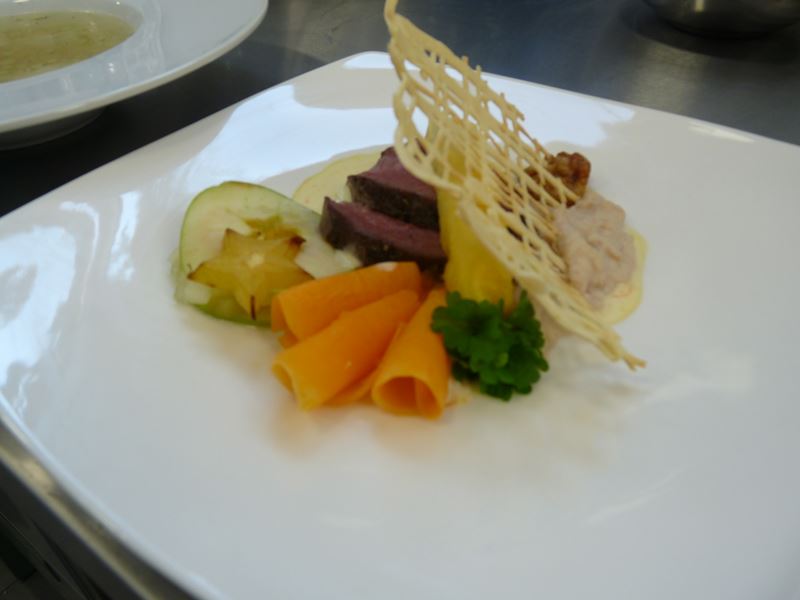 Stek z dziczyzny, salsa owocowa, purée selerowe, sos pomarańczowy, ażurowy naleśnik