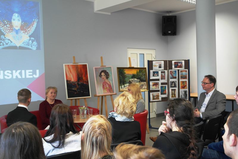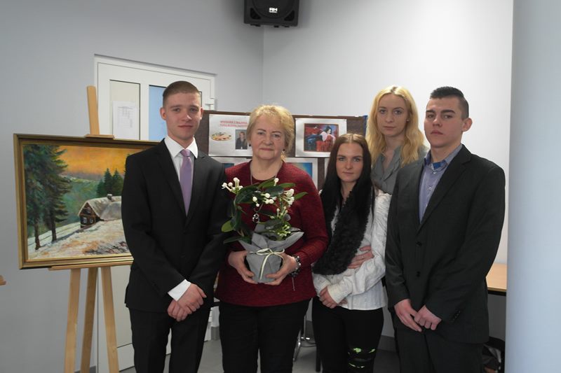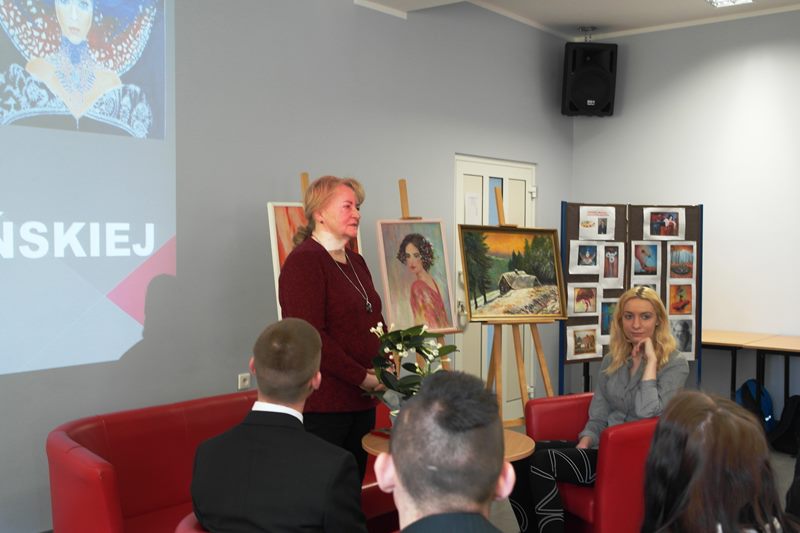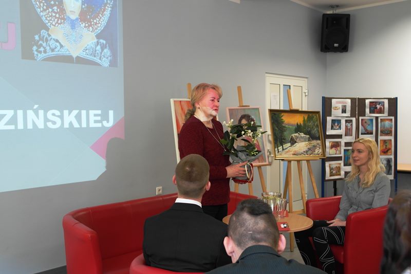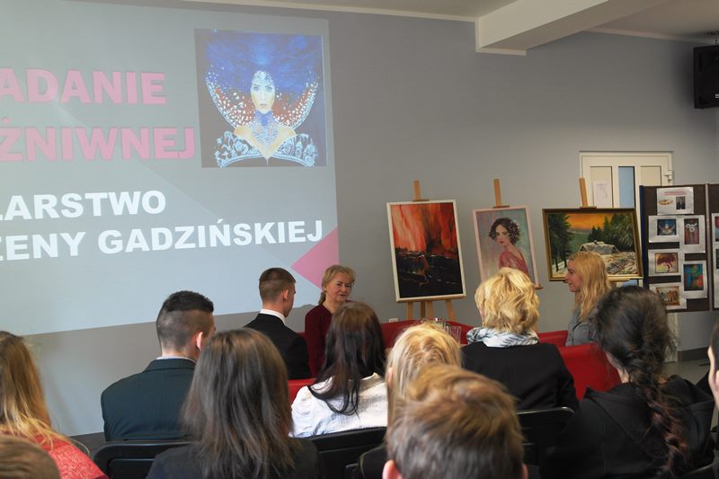 Uczniowie z dużym zainteresowaniem wysłuchali wywiadu z Panią Bożeną, która opowiedziała o swojej pasji i sposobie powstawania obrazów, stosowanych technikach plastycznych. Podczas spotkania okazało się, że kilku z naszych uczniów pasjonuje się malowaniem. Pani Bożena udzieliła im kilku ważnych wskazówek. Po spotkaniu Pani Gadzińska zwiedziła naszą szkołę, którą była zachwycona. Na zakończenie uczniowie klasy cukierniczej poczęstowali naszego gościa swoimi wypiekami, które przygotowali pod kierunkiem pani Natalii Torchały.