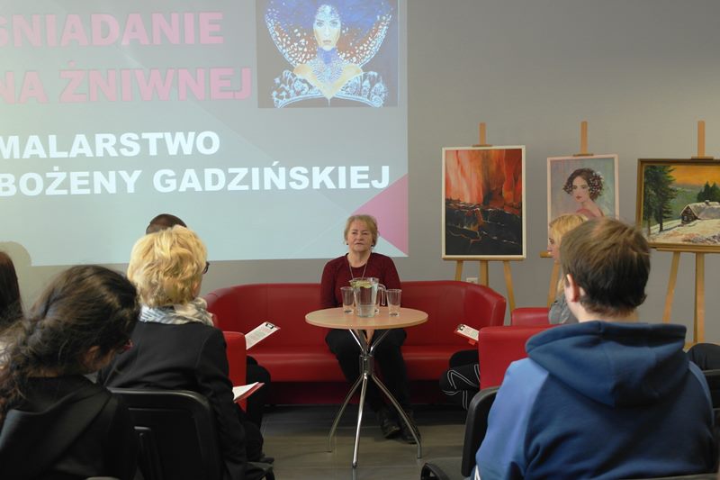 20 marca o godzinie 10.30 w świetlicy szkolnej odbyło się kolejne spotkanie z cyklu ŚNIADANIE NA ŻNIWNEJ z poznańską malarką Bożeną Gadzińską.