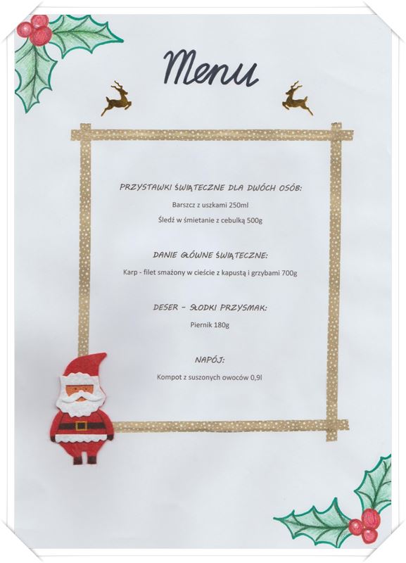 Zadanie konkursowe polegało na wykonaniu nakrycia stołu dla dwóch osób do KOLACJI WIGILIJNEJ oraz zaprojektowaniu karty menu na ten wyjątkowy dzień. Oceniane były m.in. wrażenia estetyczne, wykorzystane dekoracje oraz dobór potraw w menu. Na podstawie przesłanych zdjęć jury wyłoniło zwycięzcę.