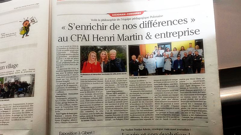 Przez okres ponad dwóch tygodni, od 8 do 19 kwietnia 2019 r. uczniowie naszej szkoły przebywali w miejscowości LEZIGNAN - CORBIERES na południu Francji , gdzie odbywali, w ramach programu Erasmus + specjalistyczne staże zawodowe. Nasi młodzi cukiernicy, kucharze, mechanicy samochodowi oraz fryzjerzy mogli doskonalić swoje umiejętności zawodowe pod okiem doświadczonych francuskich fachowców zrzeszonych W IZBIE RZEMIEŚLNICZEJ CENTRE DE FORMATION D’APPRENTIS HENRI MARTIN z siedzibą przy AVENUE DES GENÊTS W LEZIGNAN CORBIERES.