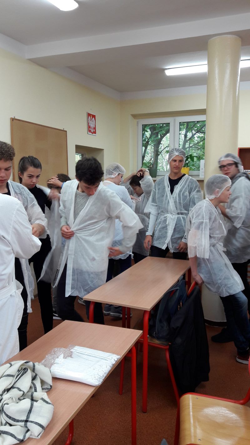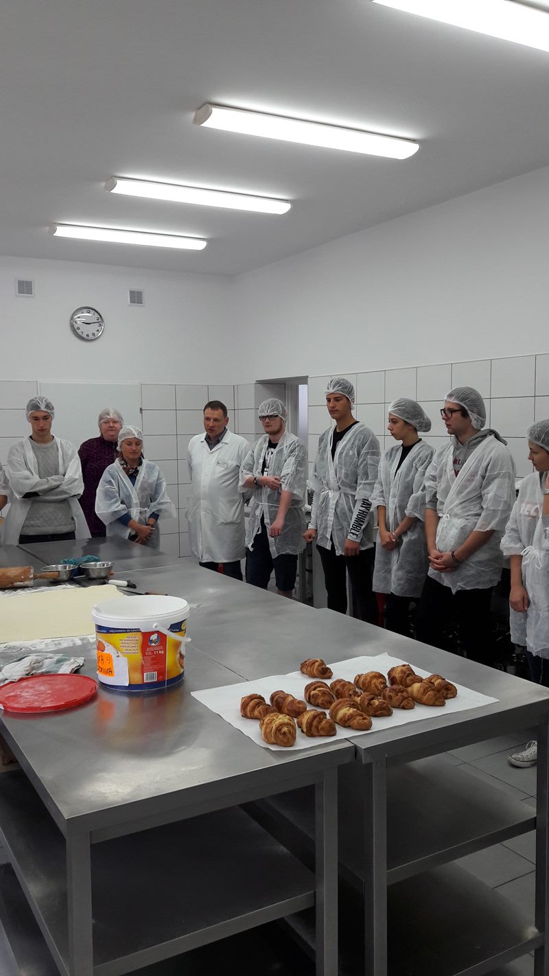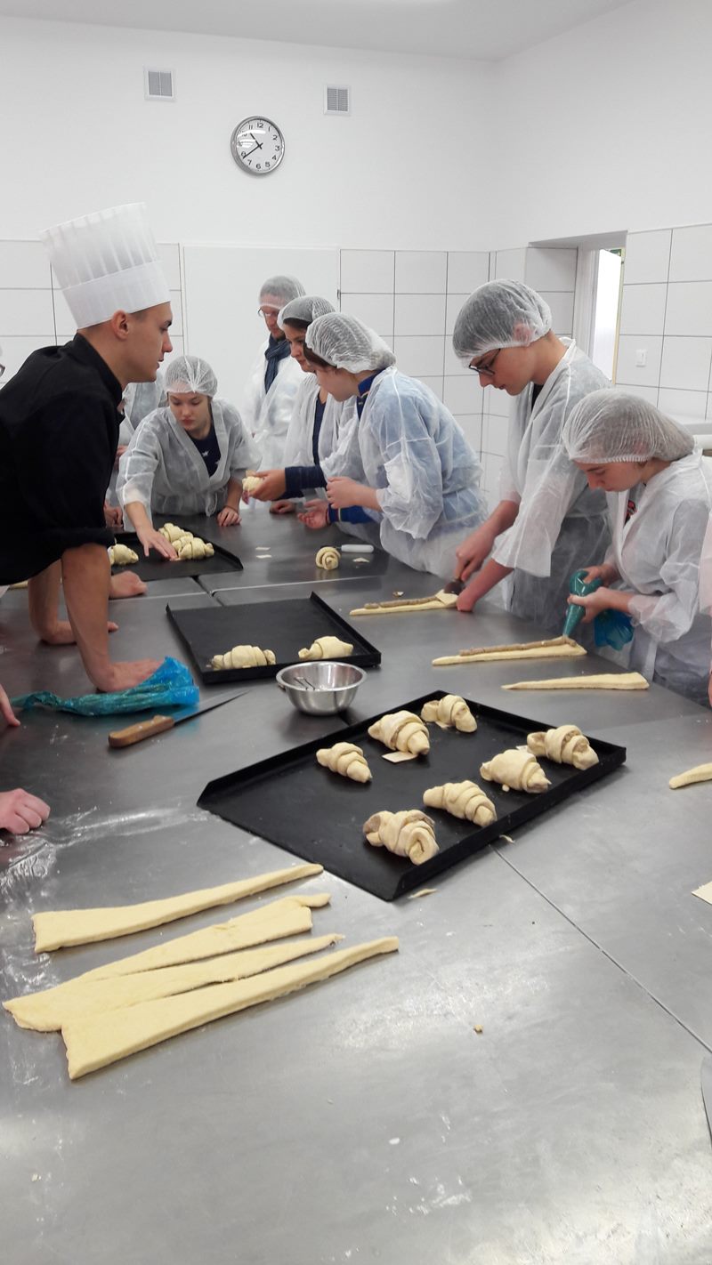 15 września br. ponownie gościliśmy w Naszej szkole uczniów z 9 LO w Poznaniu oraz Realschule w Marsbergu wraz z opiekunami. Celem tej wizyty był udział w warsztatach cukierniczych „Rogal świętomarciński”. Gości powitał oraz wprowadził w tajniki wypieku rogali Pan Karol Morawski. Drugą częścią warsztatów było samodzielne przygotowanie rogali do wypieku. Pomocą służyli Pani Natalia Torchała oraz uczniowie klasy trzeciej, kształcący się w zawodzie cukiernik – Paulina Błażejewska i Dominik Kukiełka. Licealiści byli pod dużym wrażeniem umiejętności cukierniczych naszych uczniów. Gdy rogale wypiekały się w piecu goście przeszli przyspieszony kurs obsługi kasy fiskalnej. Po wypieku uczestnicy warsztatów również dekorowali rogale. Najprzyjemniejszym punktem wizyty była oczywiście degustacja. Naszym gościom z Niemiec bardzo smakował nasz poznański rogal świętomarciński, wielu z nich zabrało samodzielnie przygotowane wypieki do Marsberga. Warsztaty zorganizowali: Pani Iwona Wielgosik, Pani Natalia Torchała oraz Pan Karol Morawski.
