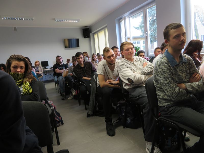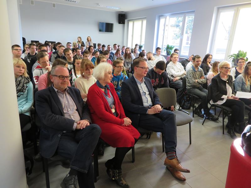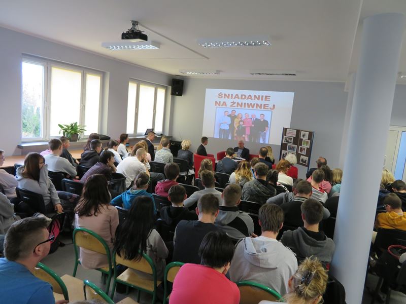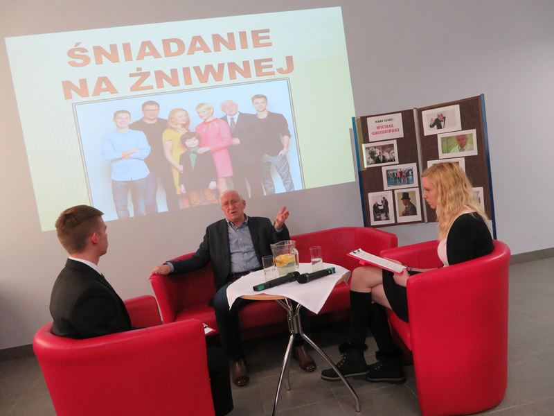 Na samym początku Pan Dyrektor zaprosił gościa na śniadanie przygotowane przez uczniów klasy kucharskiej pod kierunkiem pań M. Dezor i S. Sobierajskiej. Słodkości przygotowali uczniowie uczący się w zawodzie cukiernik pod kierunkiem pani N. Torchały. Uczniowie z dużym zainteresowaniem wysłuchali wielu pytań do p. Michała Grudzińskiego i jego błyskotliwych odpowiedzi. Aktor był zachwycony pysznym śniadaniem i pysznymi ciastkami oraz wzorowym zachowaniem naszej młodzieży. Przygotowaniem pytań i młodzieży do wywiadu zajęła się p. I. Wlazło, natomiast wystrój świetlicy przygotowały panie: M. Neyman i O. Murawska.