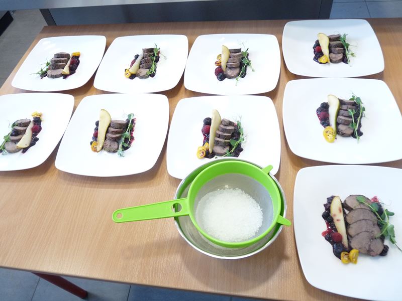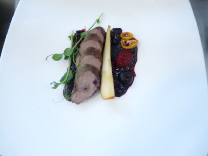 Comber z sarny w sosie z leśnych owoców z wąsatym groszkiem