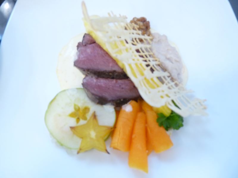 Stek z dziczyzny, salsa owocowa, purée selerowe, sos pomarańczowy, ażurowy naleśnik